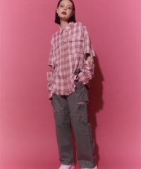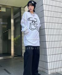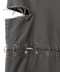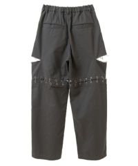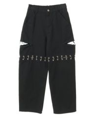 パンキッシュなリングディティールが目を惹くパンツ。 裾に向かって細くなるテーパードシルエットでスッキリとしたバランスでご着用いただけます。 太もも部分にスラッシュを入れて抜け感をプラス。 後ろ側のウエストはゴム仕様になっており着心地も◎ オーバーサイズ~コンパクトなトップスとの相性も抜群です。 コーディネートのアクセントに最適なアイテム。