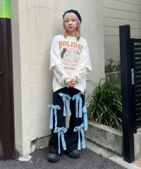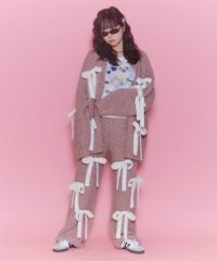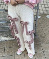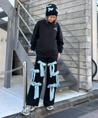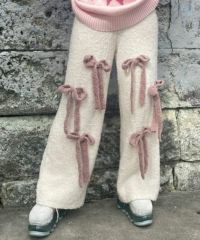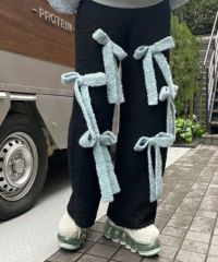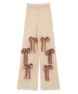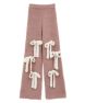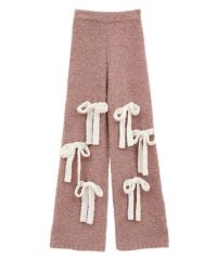 ニット素材のリボンを散りばめたニットパンツ。 ボディのカラー展開によってリボンのカラーリングが異なります。 どんな体型の方にも合う、ストンとしたストレートなシルエット。 同シリーズのカーディガン、ビーニーとのコーディネートもおすすめです。