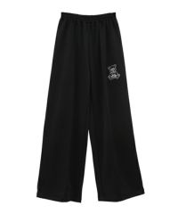 程よい肉感のエステルポンチ素材を使用しワイドなシルエットに仕上げたトラックパンツ。 フロント部分にはセンタープレスを入れてアクセントをプラス。 ウエスト部分はゴム仕様にし、サイズ調整ができるように内側にスピンドルを通しており機能性も◎ ワンポイントで施したアメコミタッチのベアモチーフの刺繍もポイント。 同じグラフィックを使用したコーチジャケットを組み合わせた着こなしはもちろん、 テーラードジャケットやシャツを組み合わせたスポーツミックスなスタイリングもオススメ。 シーズンレスでご着用いただける1着です。