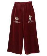 鳥獣戯画に猫の妖怪モチーフを組み合わせた刺繍がインパクト大のトラックパンツ。 光沢感が美しいポリエステル混のコットンベロアを使用しヴィンテージライクなムードを演出。 ウエスト部分はオールゴム仕様でリラクシーな履き心地。 ワイドなシルエットに仕上げているのでオーバーサイズ~コンパクトなトップスとも相性◎ 同シリーズのトラックジャケットと組み合わせてセットアップでの着こなしもオススメです。 冬のストリートスタイルに最適な主役級の1枚です。