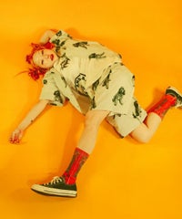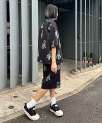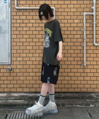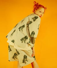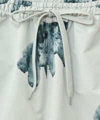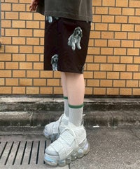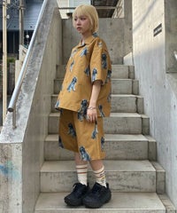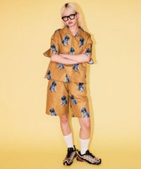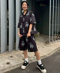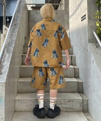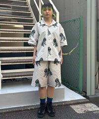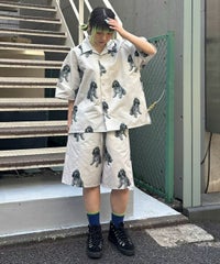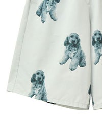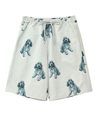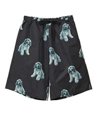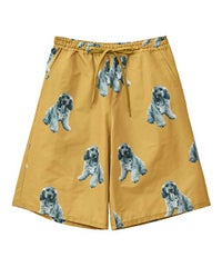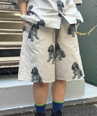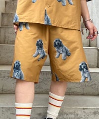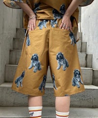 犬モチーフの総柄プリントが目を惹くタフタ素材のハーフパンツ。 ウエスト部分はスピンドルが通してあり、サイズ調節が可能。 同柄のシャツを合わせたセットアップのコーディネートもおすすめです。