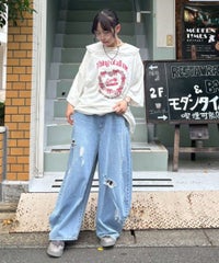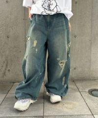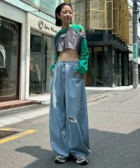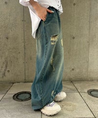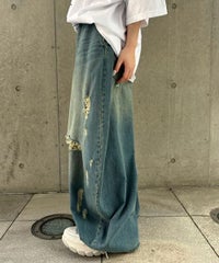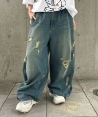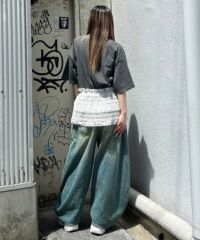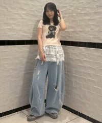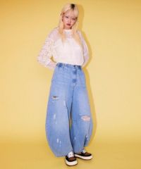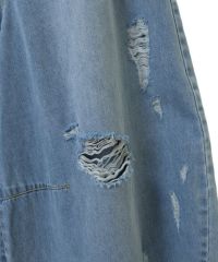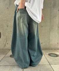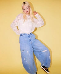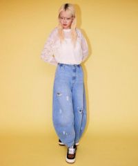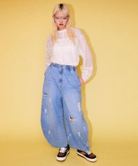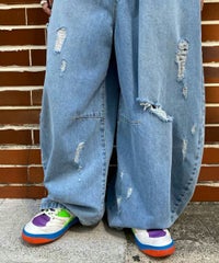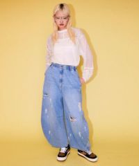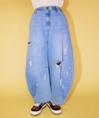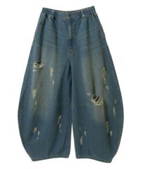 トレンド感のあるバレルシルエットに仕上げたデニムパンツ。 腰回りはすっきりとしたデザインにすることでシルエットにメリハリを効かせました。 ウエスト部分はゴム仕様・内側にスピンドルを通しておりサイズ調整が可能。 ランダムに施したダメージ加工でビンテージ感を演出。 オーバーシルエットなトップスはもちろん、タックインのスタイリングにも相性抜群。 モードからストリートまで幅広い着こなしをお楽しみいただけます。
