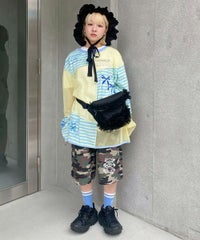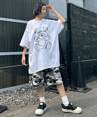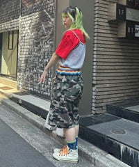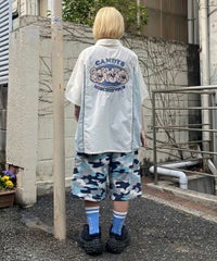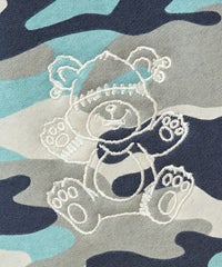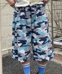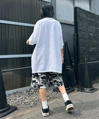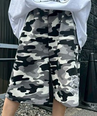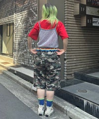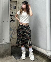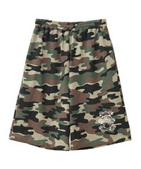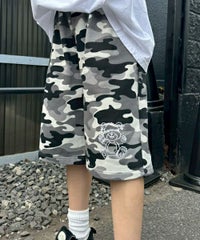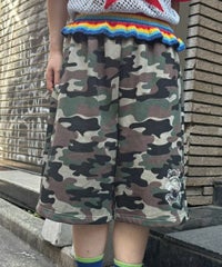 カモフラージュ柄の薄手の裏毛素材を使用したワイドシルエットのハーフパンツ。 ウエスト部分はゴム仕様でストレスフリーな履き心地に。 内側にはスピンドルを通しておりサイズ調節が可能です。 裾に施したフランケンベアの刺繍もポイント。 オーバーシルエットのトップスとの組み合わせはもちろん、 タンクトップなどのコンパクトサイズのトップスを組み合わせてメリハリを 持たせた着こなしもオススメです。 タウンユースからレジャーシーンまで幅広い用途でご着用いただけます。