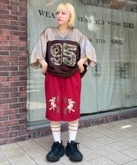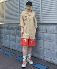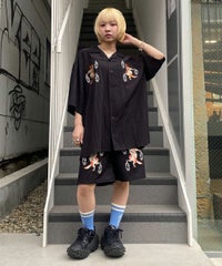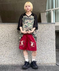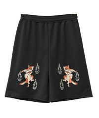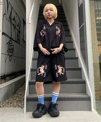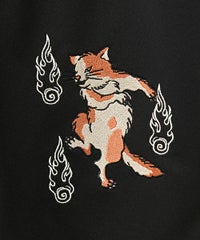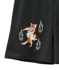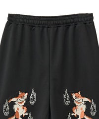 刺繍で表現した猫の妖怪モチーフがインパクト大なトラックパンツ。 程よい厚みのエステルポンチを使用し、ウエスト部分はゴム仕様にすることで リラクシーな着心地に仕上げました。 内側にスピンドルを通しておりサイズ調整が可能です。 同じグラフィックを使用したチャイナシャツを組み合わせて セットアップ風に着こなしていただくこともオススメです。 タウンユースはもちろん、レジャーシーンにも活躍する1枚です。