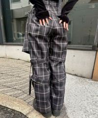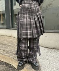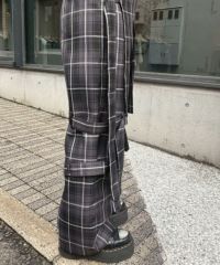 前側にプリーツのフラップが付いたボンテージパンツ。 パンツは程よいワイドなシルエットにすることで抜け感を演出。 ベルトは取り外し可能な仕様でお好みで調節が可能。 張り感がありシワになりにくいエステルツイルを使用。 パンキッシュな着こなしに最適なチェック2色と、 モード感があるブラック(無地)の3色展開。 同コレクションで展開しているボーダーのニットを組み合わせた”王道パンク”な着こなしや カレッジテイストなカーディガンを組み合わせたトラッドな着こなしもオススメ。 組み合わせ次第でパンク~モードまで幅広い着こなしをお楽しみいただけます。 ・・・・・・・・・・・・・・・・・・・・・・ ・透け感:なし ・伸縮性:なし ・生地の厚さ:普通 ・裏地:なし ・・・・・・・・・・・・・・・・・・・・・・