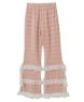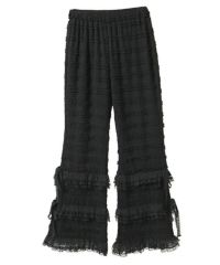 シアー感のあるフリルレース素材を使用したフレアパンツ。 脚のラインが出にくい程よくゆとりを持たせたフレアシルエットで脚長効果も◎ レースとリボンを施し、フェミニンな印象に仕上げました。 ストレッチの効いたレース素材なので、着心地が良く、ストレスフリーでご着用いただけます。 裏地付きでインナーが透けにくい&ウエスト部分はオールゴム仕様でリラクシーな履き心地。 ワンピースやスカートの下に重ねたレイヤードスタイルもオススメ。 ガーリーな着こなしにピッタリです。 ・・・・・・・・・・・・・・・・・・・・・・ ・透け感:ややあり ・伸縮性:あり ・生地の厚さ:薄い ・裏地:あり(ショート丈) ・・・・・・・・・・・・・・・・・・・・・・