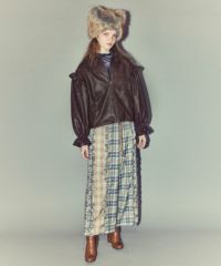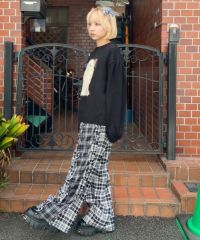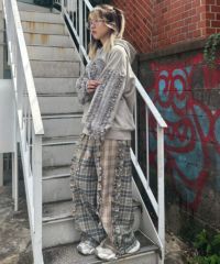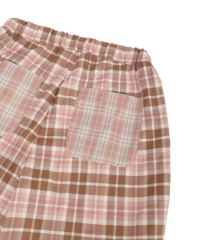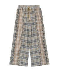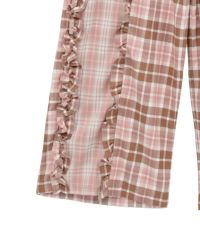 ピッチ違いのチェック柄生地を2種類使用した、フリルがアクセントのイージーパンツ。