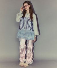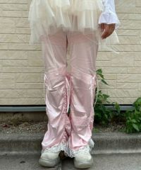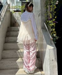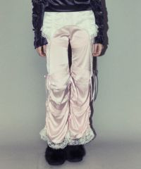 ランジェリーディティールを取り入れたパンツ。 上品な光沢感のあるマットサテンとリボン柄ジャガードを 組み合わせ、コルセットディテールにレースを施し洗練された印象に。 パンツは程よくゆとりを持たせることで 脚のラインが出過ぎないように仕上げました。 裾はドロスト仕様でお好みの丈感に調整可能。 大人ガーリーな着こなしにマッチするアイテムです。 ・ ・・・・・・・・・ ・・・・・・・・ ・透け感:なし ・伸縮性:なし ・生地の厚さ:やや薄手 ・裏地:なし ・ ・・・・・・・・・ ・・・・・・・・