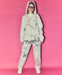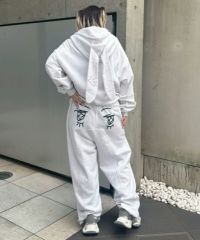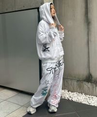 落書き風タッチで描かれたPEPEたちがポイントの、スウェットパンツです。 ランダムに配置したかすれプリントで、グランジ/ストリートな雰囲気を楽しんでいただけます。 フロントにカーブ状の切り替えを入れており、スウェットパンツですがルーズすぎない雰囲気でご着用いただけます。 パンツ裾は絞れる仕様で、お好みのシルエットでご着用いただけます。 『(1259611)GRAFFITI PRINT HOODIE』とのセットアップご着用もおすすめです! ・ ・・・・・・・・・ ・・・・・・・・ ・透け感:なし ・伸縮性:あり ・生地の厚さ:普通 ・裏地:なし ・ ・・・・・・・・・ ・・・・・・・・