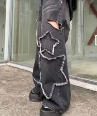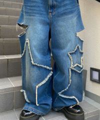 星型のパッチがポイントのデニムパンツ。 着用した際にシルエットがキレイに見えるように10.8オンスの しっかりとした厚みのデニムを使用しています。 ヴィンテージライクな風合いの加工もポイント。 ワイドなシルエットでユニセックスでお楽しみいただけます。 同じ素材・ディティールを使用したデニムジャケットを組み合わせて セットアップで着こなしていただくのもオススメ。 シーズンレスでご着用いただけるアイテムです。