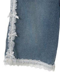 レースやリボンを付け、デコラティブなデザインのデニムパンツ。