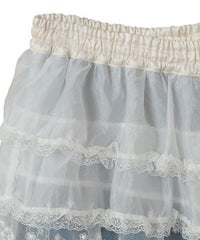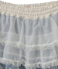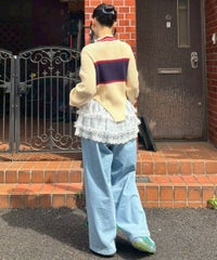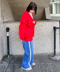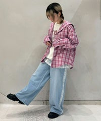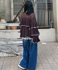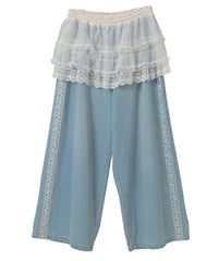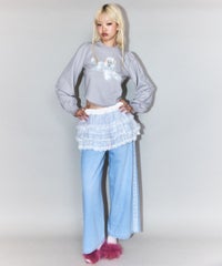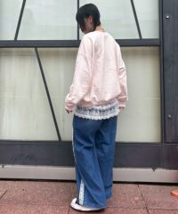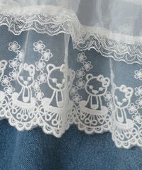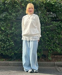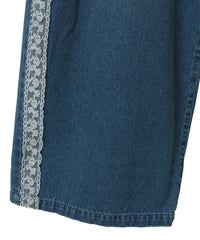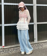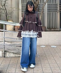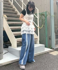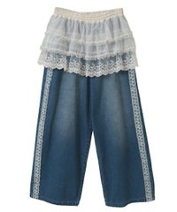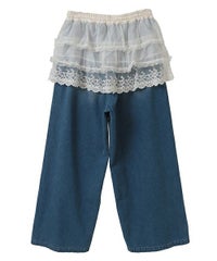オーガンジーのティアードスカートをレイヤードしたデニムパンツ。 ティアードの下段には遊び心のあるレースを使用し、キャッチーな印象に◎ 程よい厚みの8.8オンスデニムを使用。 ウエスト部分はスピンドルを通してあり、サイズ調節が可能。 やや太めのストレートなシルエットで、程よくカジュアルに仕上げました。 ・・・・・・・・・・・・・・・・・・・・・ ・透け感:なし ・伸縮性:なし ・生地の厚さ:普通 ・裏地:なし ・・・・・・・・・・・・・・・・・・・・・