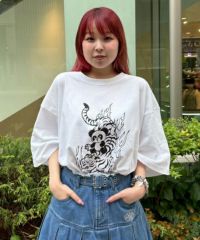 オリジナルキャラクターのPEPEとタイガーモチーフを組み合わせた オリエンタルテイストなグラフィックがインパクト大なBIG TEE。 インナーが透けにくく適度な厚みがある17/-天竺を使用しています。 オーバシルエットなサイジングでユニセックスでご着用いただけます。 トップスとしてはもちろん、小柄な方は1枚でワンピース風に着こなしていただいても◎ ストリートライクな着こなしをお楽しみください。
