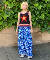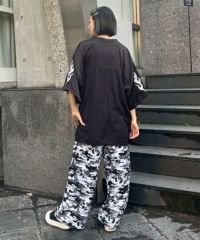 軽やかな質感のエステルタフタ素材を使用したカーゴパンツ。 オリジナルキャラクターの「PEPE」をカモフラージュ柄に落とし込んだ総柄がインパクト大。 程よいワイドシルエットで、オーバーシルエットのトップスはもちろん コンパクトサイズのトップスまで様々なトップスと相性も◎ ウエスト部分はゴム仕様にすることでストレスフリーな着心地に。 同じカモフラージュ柄を使用したナンバリングトップスを組み合わせた着こなしもオススメ。 夏のストリートスタイルに最適な1着です。
