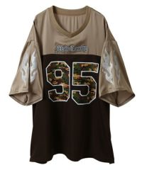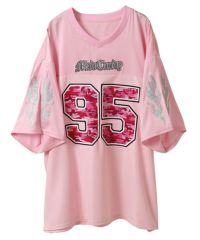マイクロメッシュとサテンを組み合わせたナンバリングトップス。 カモフラージュ柄に溶け込んだオリジナルキャラクターの「PEPE」にもご注目。 両袖のシャイニーに仕上げたファイヤーパターンでアクセントをプラス。 オーバーシルエットなサイズ感で、ワイドパンツやハーフパンツと相性◎ ナンバリング部分のカモフラージュ柄と同じ配色のカーゴパンツを 組み合わせた着こなしもオススメです。 1枚でトレンド感のある着こなしをお楽しみいただけます。