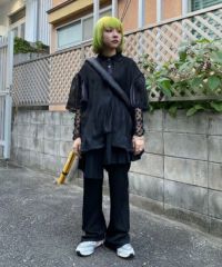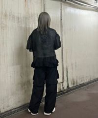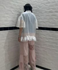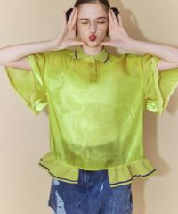 光沢感のあるオーガンジー素材を使用したポロトップス。 裾の編み立てリブのフリルや袖口のレース使いなどリメイク感のあるディティールもポイント。 着こなし次第で幅広いスタイリングにハマります。 遊び心のあるアイテムに仕上がりました。