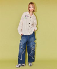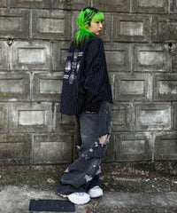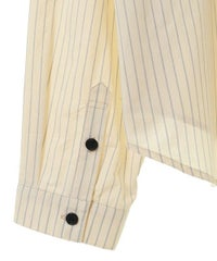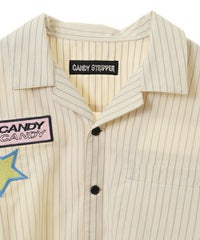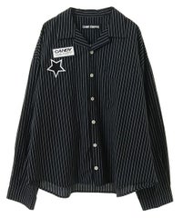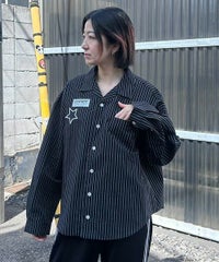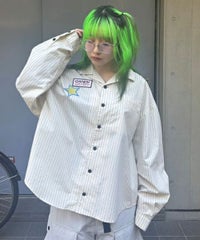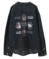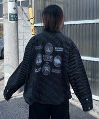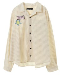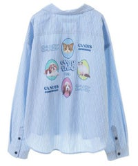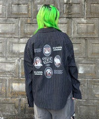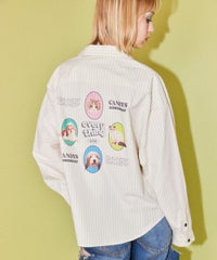 バックのフォトプリントがキュートなストライプシャツ。 フロントには古着風のワッペンを縫い付けました。 着る人を選ばない、シンプルで使いやすいサイズ感もポイント。 前を閉めてトップスとしてはもちろん、羽織としてご着用いただくのもおすすめです。