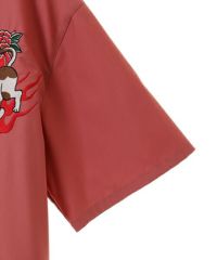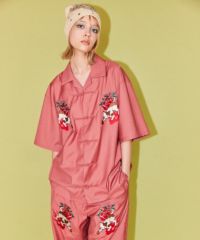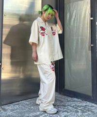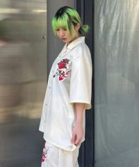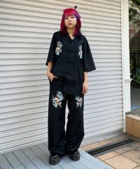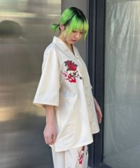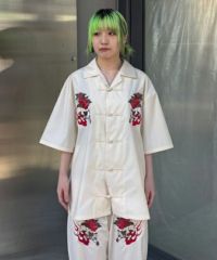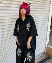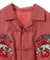オリエンタルな雰囲気のキャットモチーフの刺繍を入れたチャイナシャツ。 シワになりにくいT/Rツイル素材を使用しておりお手入れのしやすさも◎ 程よいオーバーシルエットでユニセックスでご着用いただけます。 同じグラフィックを使用したパンツを組み合わせて セットアップで着こなしていただくこともオススメです。 ベーシックにご着用いただけるアイボリーとブラック、 スタイリングのアクセントに最適なピンクの3色をご用意。 ストリートな着こなしにぴったりな1枚です。