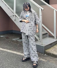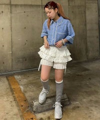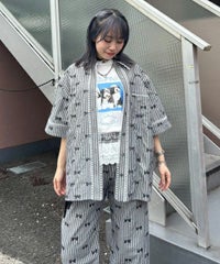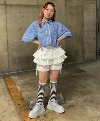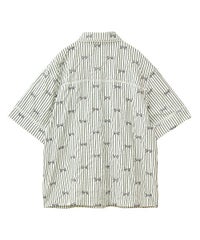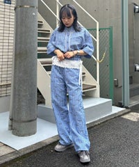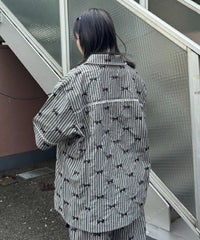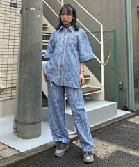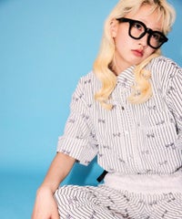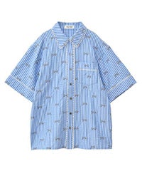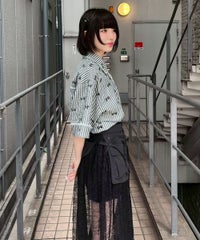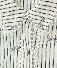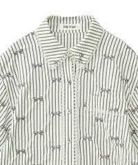 オリジナルのリボン柄をストライプ素材に刺繍したシャツ。 衿や前立て、袖口の切り替え部分にさりげなく挟んだチュールレースもポイント。 ベーシックでシンプルなシルエットで、カジュアルにもガーリーにもご着用いただけます。 同素材を使用したパンツと合わせたセットアップのコーディネートはもちろん、 インナーにキャミソールやコンパクトTを合わせ、羽織としてのご着用もおすすめです。
