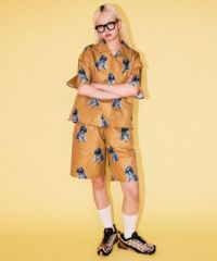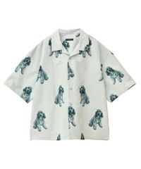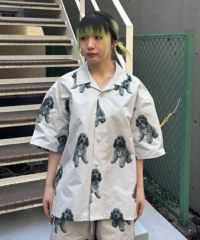 犬モチーフの総柄プリントが目を惹くタフタ素材のシャツ。 程よくゆったりとしたシルエットで、ボタンを閉めてトップスとしてはもちろん羽織としてもご着用いただけます。 夏フェスやレジャーシーンでも◎ 同柄のハーフパンツを合わせたセットアップのコーディネートもおすすめです。