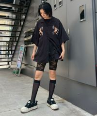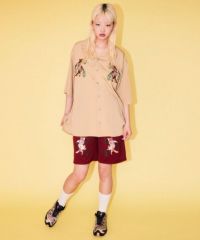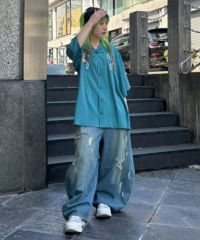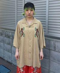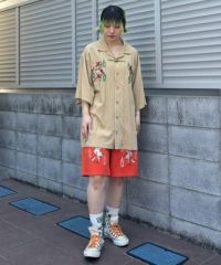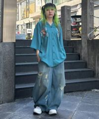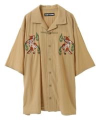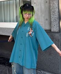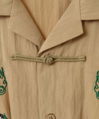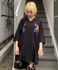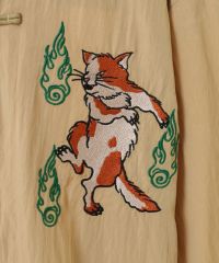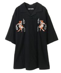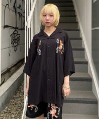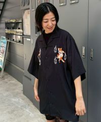 身頃に刺繍で表現した猫の妖怪モチーフがインパクト大なチャイナシャツ。 しなやかな質感のレーヨン混のブロード素材を使用し着心地も◎ オーバーシルエットなサイジングでユニセックスでお楽しみいただけます。 シャツとしてはもちろん、ボタンを開けて軽めの羽織りにも最適です。 ダメージデニムやトラックパンツを組み合わせた着こなしがオススメ。 ストリートスタイルにぴったりな1枚です。