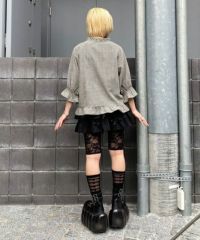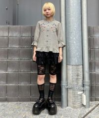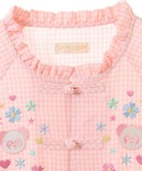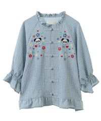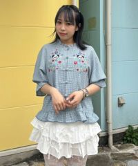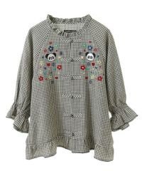 キャンディならではのチャイナディティールをガーリー雰囲気に落とし込んだブラウス。 袖部分はラグランにすることでパフスリーブのデザインでも着膨れして見えずすっきりとしたバランスに仕上げました。 袖口部分はホールド感のあるゴム仕様で機能性も◎ 身頃部分にはオリジナルキャラクターの「PEPE」とフラワーモチーフを組み合わせたグラフィックの刺繍がポイント。 レーヨン混のギンガムチェックを使用した軽やかな着心地で1枚ではもちろん、軽い羽織りとしても最適。 デニムなどのカジュアルなボトムはもちろん、ガーリーなテイストのボトムを組み合わせたスタイリングもオススメ。