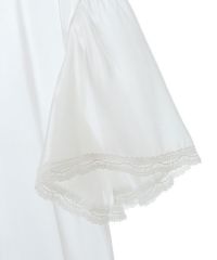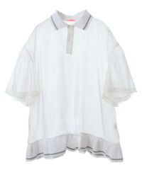 光沢感のあるオーガンジー素材を使用したポロトップス。 裾の編み立てリブのフリルや袖口のレース使いなどリメイク感のあるディティールもポイント。 着こなし次第で幅広いスタイリングにハマります。 遊び心のあるアイテムに仕上がりました。