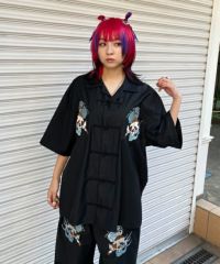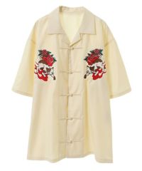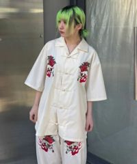 オリエンタルな雰囲気のキャットモチーフの刺繍を入れたチャイナシャツ。 シワになりにくいT/Rツイル素材を使用しておりお手入れのしやすさも◎ 程よいオーバーシルエットでユニセックスでご着用いただけます。 同じグラフィックを使用したパンツを組み合わせて セットアップで着こなしていただくこともオススメです。 ベーシックにご着用いただけるアイボリーとブラック、 スタイリングのアクセントに最適なピンクの3色をご用意。 ストリートな着こなしにぴったりな1枚です。