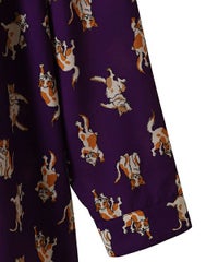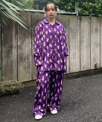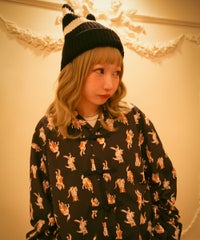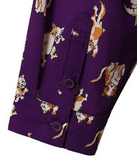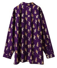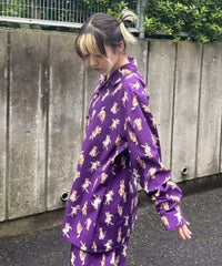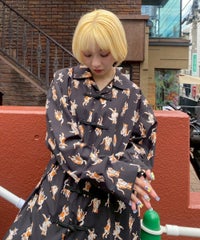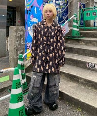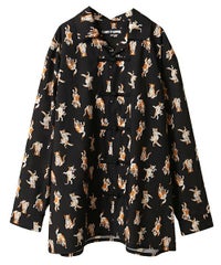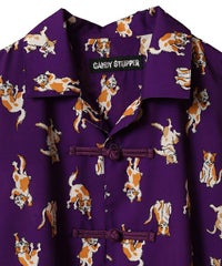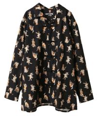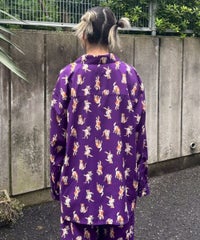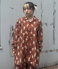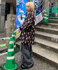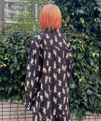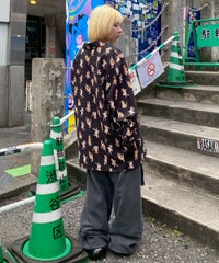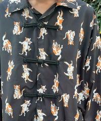 鳥獣戯画タッチで描かれたキャットモチーフの 総柄がインパクト大なチャイナシャツ。 様々なポーズや表情のキャットモチーフにもご注目。 オーバーシルエットでユニセックスでお楽しみいただけます。 シワになりにくくサラッとした軽やかなポリエステル素材を使用しており着心地も◎ トップスとしてはもちろん、前を開けて軽めのアウターとしてもご着用いただけます。 同シリーズのボトムとの組み合わせはもちろん、 ダメージデニムやトラックパンツを組み合わせたルーズな着こなしもオススメです。 主役級にキマる1枚です。 ・・・・・・・・・・・・・・・・・・・・・・ ・透け感:なし ・伸縮性:なし ・生地の厚さ:普通 ・裏地:なし ・・・・・・・・・・・・・・・・・・・・・・