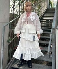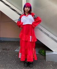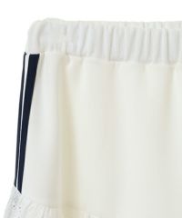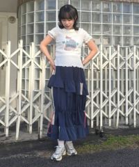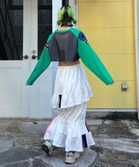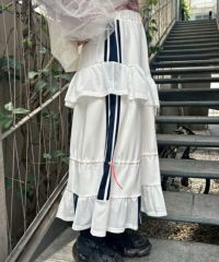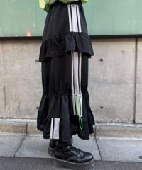 軽やかなジャージ素材のロングスカート。 ウエスト部分はゴム仕様になっておりストレスフリーな履き心地。 サイドに入ったラインと、ボリューミーなメッシュのフリルがポイント。 裾部分には左右で絞れるネオンカラーのゴム入りで、お好みのシルエットでご着用いただけます。