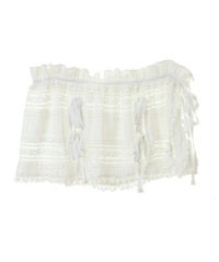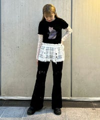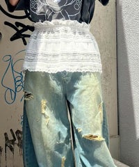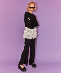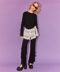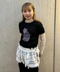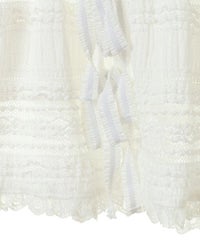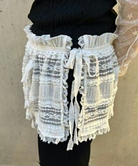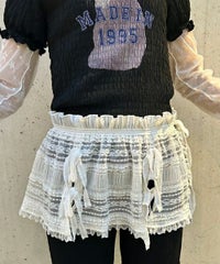 レースを使用したガーリーな雰囲気のエプロン。 スリット部分のリボンディティールでアクセントもプラス。 ウエスト部分は紐でお好みのサイズ感に調整が可能。 フレアパンツやデニムなどに組み合わせていただく着こなしがオススメ。 ミニ丈に設定することで程よく腰回りをカバーできるのも嬉しい。 スタイリングに取り入れていただくことで春らしさを演出できます。 ガーリーな着こなしのアクセントに最適なアイテムです。