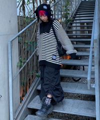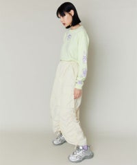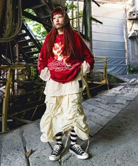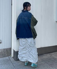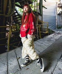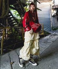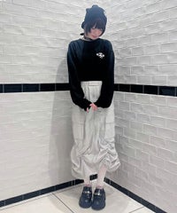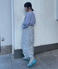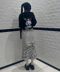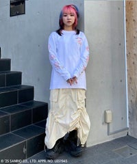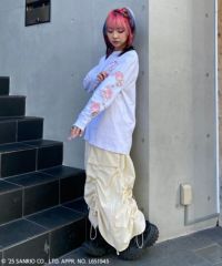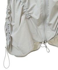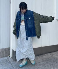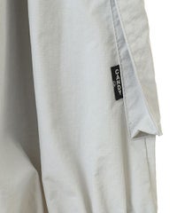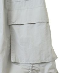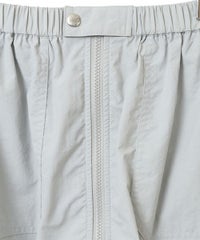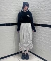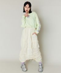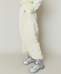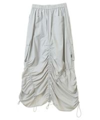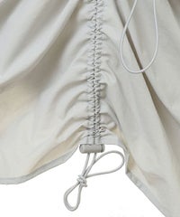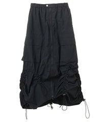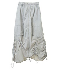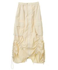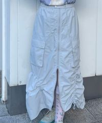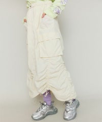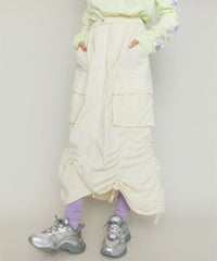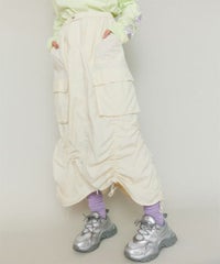 裾部分にあしらったドローコード使いがポイントのカーゴスカート。 ドローコードは調節可能でお好みのシルエットにアレンジ可能。 ウエスト部分をすっきりとさせ、ポップになりすぎないように Aライン気味のシルエットにすることで女性らしさをプラス。 ナイロンタフタ素材を使用しており軽やかな履き心地に仕上げています。 ストリートスタイルに最適なアイテムです。