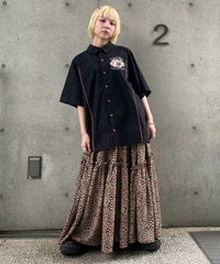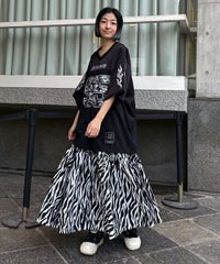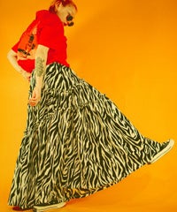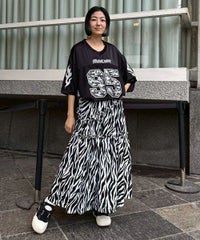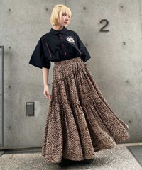 薄手のポリエステル素材を使用したティアードスカート。 斜めに入れたティアードデザインでアクセントをプラス。 ウエスト部分はゴム仕様でリラクシーな履き心地に仕上げました。 スタイリングのアクセントにぴったりなゼブラ柄とレオパード柄をご用意。 Tシャツはもちろん、開襟シャツやキャミソールなどのトップスとも相性◎ ストリートスタイルにぴったりな1枚です。