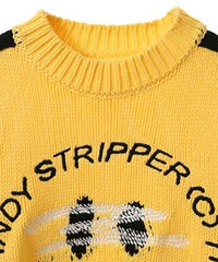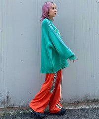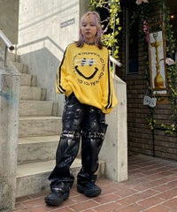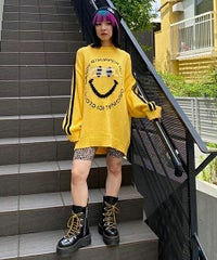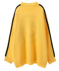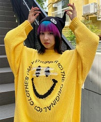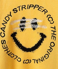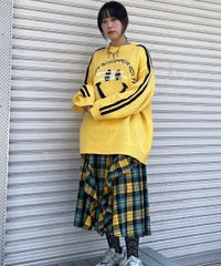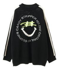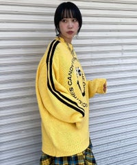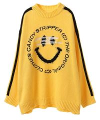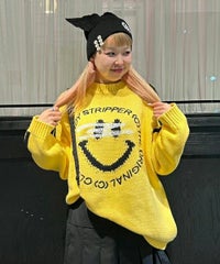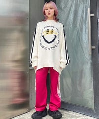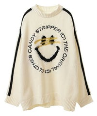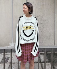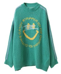 ローゲージでざっくりとした風合いに仕上げたスマイルモチーフのニットトップス。 肩~袖のライン使い・ポップなカラーリングがポイント。 程よいオーバーシルエットでスカートにもパンツにも相性が良いサイズ感に仕上げています。 着丈に前後差を付けることでスタイルアップ効果も◎ コーディネートのアクセントに最適なアイテムです。