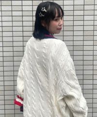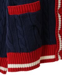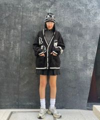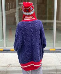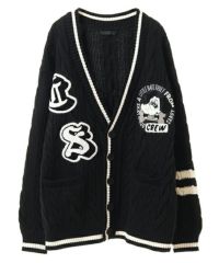 コットン・アクリルの混紡ニット素材を使用したカレッジテイストなVネックカーディガン。 ケーブル編みのアラン模様を施し、温かみのあるニットカーディガンに仕上げました。 サガラ刺繍で表現したCSロゴと骨に見立てたスケボーを咥えたドッグモチーフがポイント。 襟・裾・袖口・ポケット・ラインを配色にし、アクセントに。 オーバーシルエットでユニセックスな雰囲気に仕上げています。 程よいボリューム感で、カーディガンとしてはもちろん季節の変わり目のアウターとしても活躍します。 ストリートなスタイリングにぴったりなアイテムです。