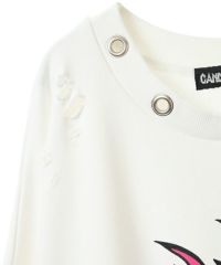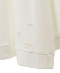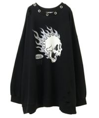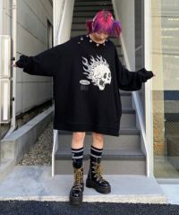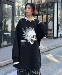 スカルモチーフを染み込みプリントでプリントしたオーバーシルエットのトップス。 衿リブに付けた大きめのハトメやダメージ加工など パンキッシュなディティール使いもポイント。 薄手の裏毛素材を使用しており軽やかな着心地も◎ トップスとしてはもちろん、低身長な方は1枚でワンピース風に着こなしていただくこともオススメ。