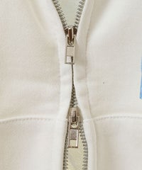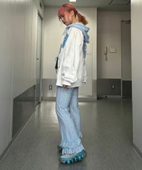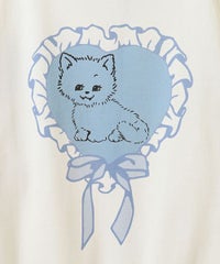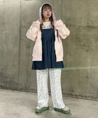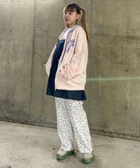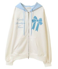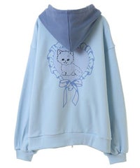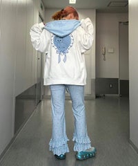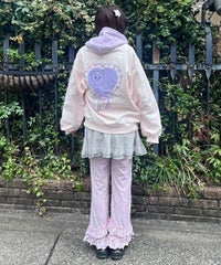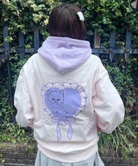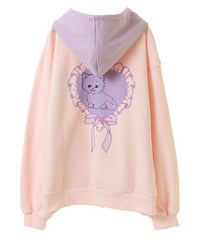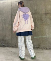 リボンやガーリーなロゴ、フリル付きのハートや猫など キュートなモチーフを盛り込んだフーディー。 程よい肉感の裏毛素材を使用しておりシーズンレスでご着用いただけます。 フロントのリボンモチーフは起毛感のあるフロッキープリントで表現しました。 フードとスピンドルをプリントと同カラーにしたのもポイント。 程よくゆるっとしたシルエットで、着る人を選ばないサイジングに。