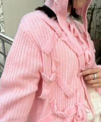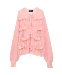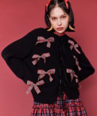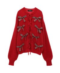 トレンドのリボンをふんだんに付けたキャッチーなニットカーディガン。 フロント部分をリボンで結ぶデザイン。結ばずに垂らしても◎。 モヘア混の糸を使用した、ふっくらと柔らかい着心地。 ざっくりとした編み地とサイズ感でレイヤードが楽しめます。 袖はボリュームを持たせつつ、袖口はきゅっとリブで絞りメリハリのあるシルエットに。 程よくゆったりとしたサイズ感で一枚でスタイリングが決まります。 色展開によってリボンが異なり、ピンクには無地のベロアリボン、レッドとブラックにはチェック柄のリボンを付けています。 フリルやチュールスカートと合わせたとびきりガーリーなスタイリングもオススメ。 ホリデーシーズンにぴったりな遊び心の効いた1枚に仕上がりました。