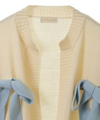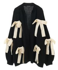 ニット素材のリボンを散りばめたカーディガンがカラーリング新たに再登場! 春先にぴったりなアクリル素材で、薄手の編み地にリニューアルしました。 あえて前立てにボタンはつけず、さらっと羽織れるようゆったりしたシルエットに。 袖口はボリュームを出し、ガーリーな印象に仕上げました。