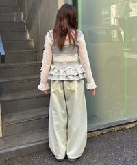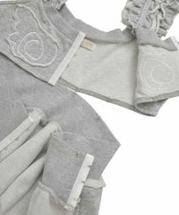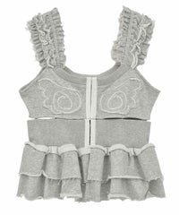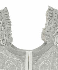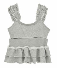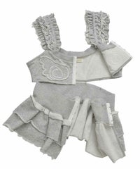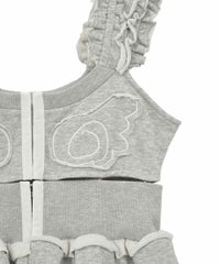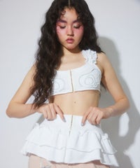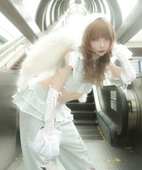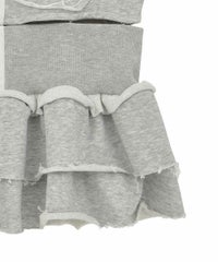 ホックで上下のパーツを分解することができる、2way仕様のスウェットビスチェ。下のペプラム部分は、スウェットパンツ等と合わせて、スカートパンツ風スタイルをお作りいただくのにも使用できます。天使の羽根モチーフがポイントですが、切りっぱなし仕様などグランジ風のディテールを採用し、ガーリーになりすぎないバランスに仕上げました。チビTやシアーインナー等と合わせてご着用いただくのがおすすめです。・・・・・・・・・・・・・・・・・・・・・・・透け感:なし・伸縮性:あり・生地の厚さ:普通・裏地:なし・ポケット:なし・・・・・・・・・・・・・・・・・・・・・・