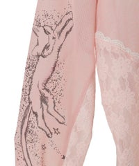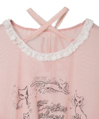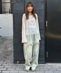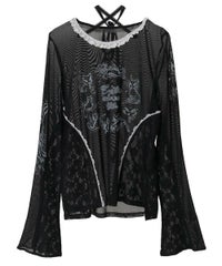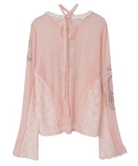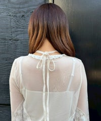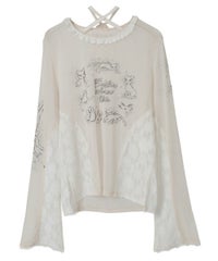 身頃と両袖にプリントした、イラストレーターkumi氏描き下ろしの繊細なイラストが目を惹くシアートップス。レースのチョーカーはボタンで取り外しが可能で、お好みで巻き方をアレンジしてご着用いただけます。細かなレース使いや袖口にかけて広がるベルスリーブもポイント。トップスとしての着用はもちろん、インナーとしても使える万能アイテムです◎――――――――――――――アーティスト名:Kumi Takahashiプロフィール:東京を拠点に活動する、自由と個性を愛するアーティスト。音楽ジャケットやファッションブランドとのコラボレーションなどを手がける。少女時代の感覚や感情の記憶を手がかりに、優しいタッチで見守るような眼差しと反抗心やもどかしさを秘めた表情を描いている。ロマンチックな物語やワイルドな冒険世界への憧れや無邪気で繊細な心の揺らぎ、愛すべき悪戯っ子の無邪気な心の穴を、優しく見守るようにビター&スウィートに表現する。――――――――――――――・・・・・・・・・・・・・・・・・・・・・・・透け感:あり・伸縮性:あり・生地の厚さ:薄手・裏地:なし・・・・・・・・・・・・・・・・・・・・・・