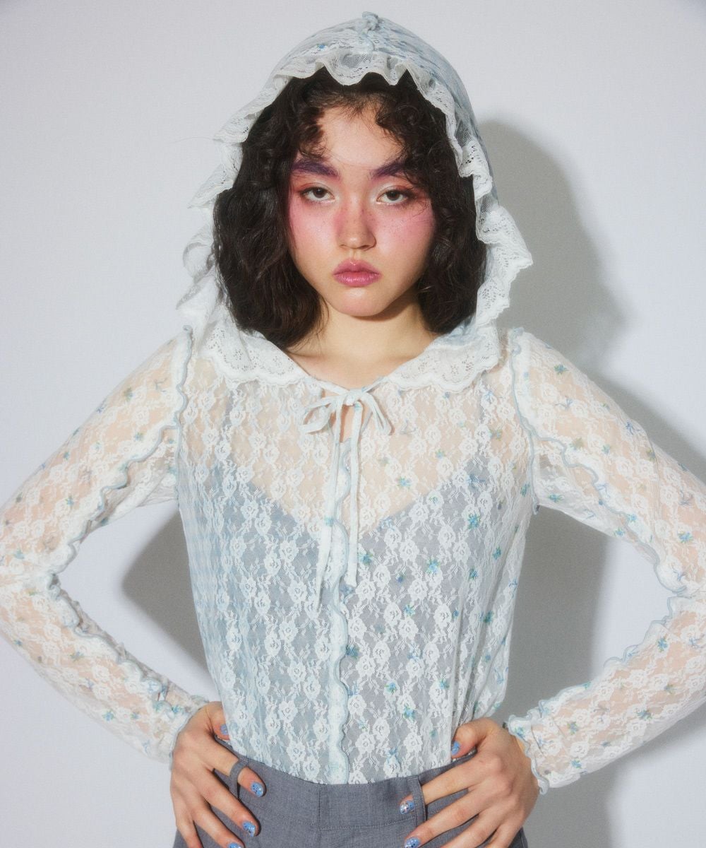 フード口にはレースをあしらい、被った際にお顔まわりを華やかに飾るデザインに仕上げました。