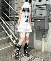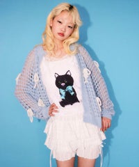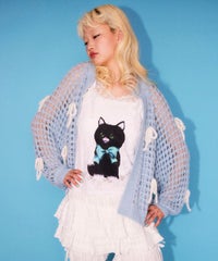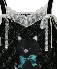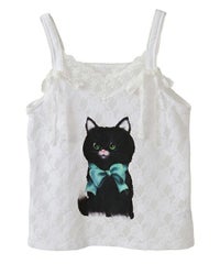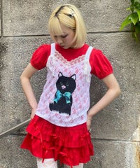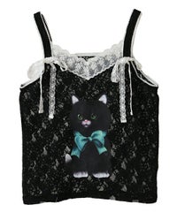 レトロなイラストタッチの黒猫をプリントしたキャミソール。 4種類のレースを使用し贅沢な仕上がりに。 トレンド感のあるコーディネートをお楽しみいただけます。
