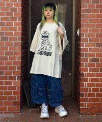 パンキッシュなドッグモチーフのグラフィックがインパクト大なラグラントップス。 程よい肉感と軽やかさのある20/-天竺を使用しており着心地も◎ オーバシルエットなサイズ感でユニセックスでご着用いただけます。 トップスとしてはもちろん、1枚でワンピース風の着こなしもオススメ。 ストリートスタイルにぴったりなアイテムです。
