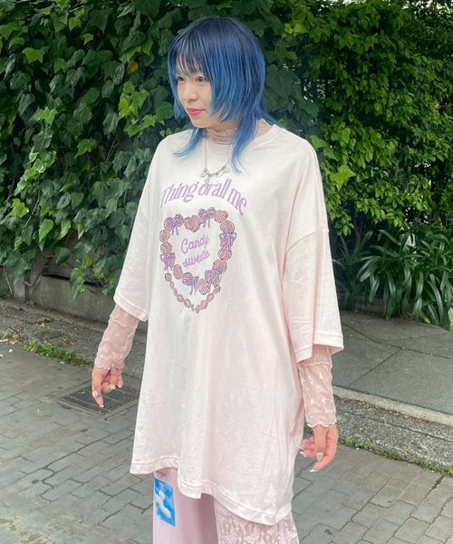 イラストタッチのケーキとロゴプリントのBIG BIG Tシャツ ●26/-天竺生地を使用したオリジナルボディ ●やわらかいコットン100%の生地を使用し着心地も抜群 ●ヒップラインも隠れる安心感のある丈 ●ゆったりとルーズに着られるオーバーサイズシルエット ●ユニセックスで着こなしが楽しめるデザイン ●背の低い方が着用した場合、ワンピースとしてもご着用いただけます