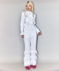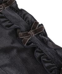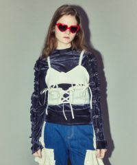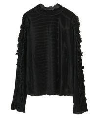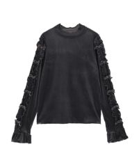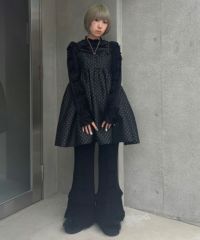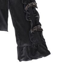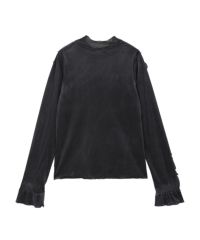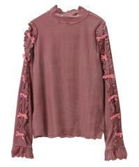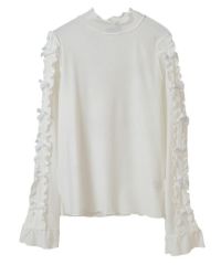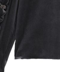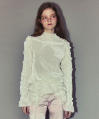 光沢感のある細コールベロア素材を使用したタートルトップス。 程よいコンパクトなサイジングに仕上げており トップスとしてはもちろんですが、レイヤードスタイルの インナーとしても最適な1枚。 両袖のフリル・リボンのディティール使いもポイント。 ベーシックにご着用いただけるオフホワイト・ブラックと、 アクセントカラーに最適なスモークピンクの3色展開。 ガーリーな着こなしにオススメな1枚です。 ・・・・・・・・・・・・・・・・・・・・・・ ・透け感:なし ・伸縮性:あり ・生地の厚さ:普通 ・裏地:なし ・・・・・・・・・・・・・・・・・・・・・・