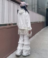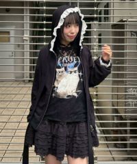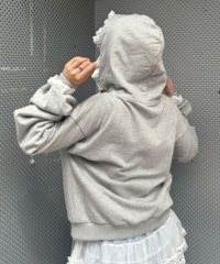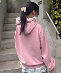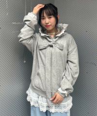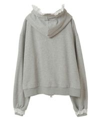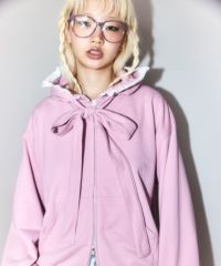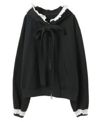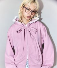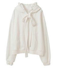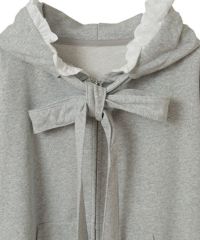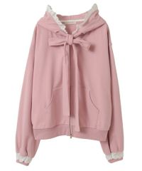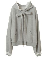 フード被り口、袖口にあしらわれたリボン柄のコットンレースがキュートなフーディー。 フードに通した共紐をリボン結びにしてアクセントに◎ 程よい肉感の裏毛素材を使用しておりシーズンレスでご着用いただけます。 ファスナー部分は両開きで、着こなしに合わせて調節可能。 程よくルーズなサイジングで、様々なスタイリングに合わせやすい万能アイテムです。 ・・・・・・・・・・・・・・・・・・・・・・ ・透け感:なし ・伸縮性:あり ・生地の厚さ:普通 ・裏地:なし ・・・・・・・・・・・・・・・・・・・・・・