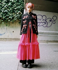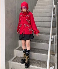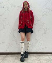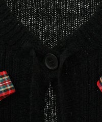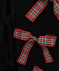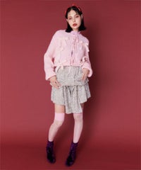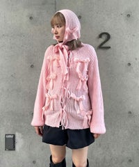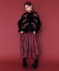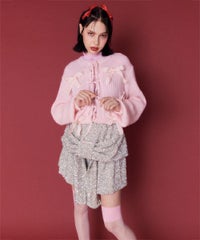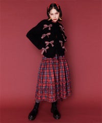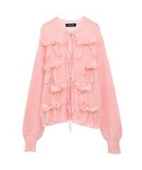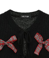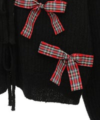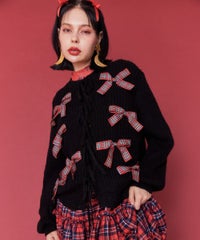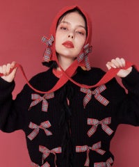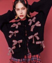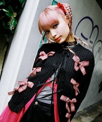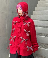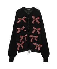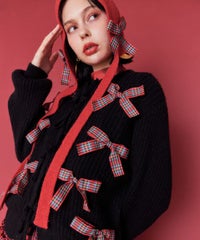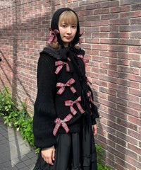 トレンドのリボンをふんだんに付けたキャッチーなニットカーディガン。 フロント部分をリボンで結ぶデザイン。結ばずに垂らしても◎。 モヘア混の糸を使用した、ふっくらと柔らかい着心地。 ざっくりとした編み地とサイズ感でレイヤードが楽しめます。 袖はボリュームを持たせつつ、袖口はきゅっとリブで絞りメリハリのあるシルエットに。 程よくゆったりとしたサイズ感で一枚でスタイリングが決まります。 色展開によってリボンが異なり、ピンクには無地のベロアリボン、レッドとブラックにはチェック柄のリボンを付けています。 フリルやチュールスカートと合わせたとびきりガーリーなスタイリングもオススメ。 ホリデーシーズンにぴったりな遊び心の効いた1枚に仕上がりました。