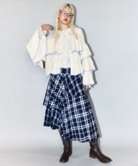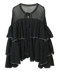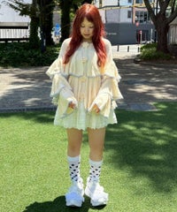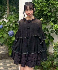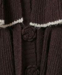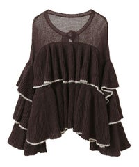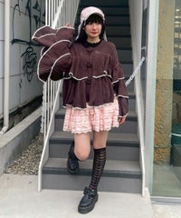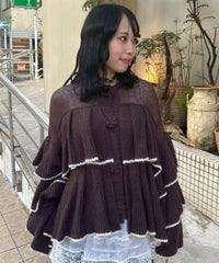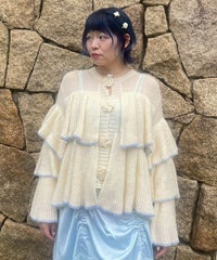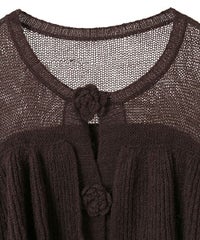 ボリュームたっぷりなフリルが目を惹くニットカーディガン。 シアーな編み地と、共糸で編まれたバラモチーフがポイント。 ふっくらと柔らかいアクリル・ナイロン・ウールの混紡糸を使用。 前立て部分はボタン付きで、前を閉じても羽織としてもご着用いただけます。 ※デリケートな編み地のため、畳んで保管することをおすすめします ※糸の性質上、サイズに多少のばらつきが出る可能性があります ・・・・・・・・・・・・・・・・・・・・・・ ・透け感:あり ・伸縮性:あり ・生地の厚さ:薄め ・裏地:なし ・・・・・・・・・・・・・・・・・・・・・・