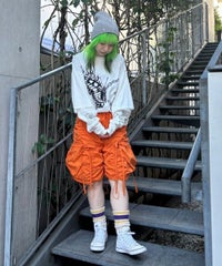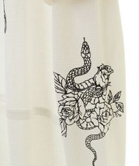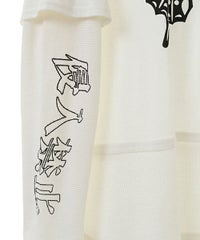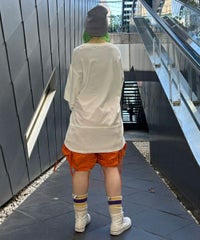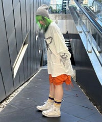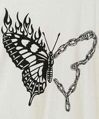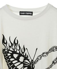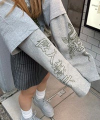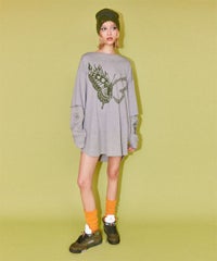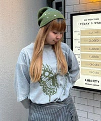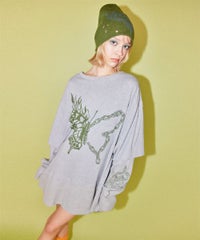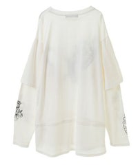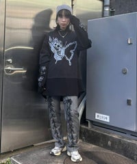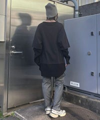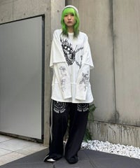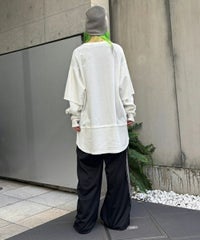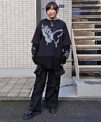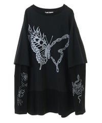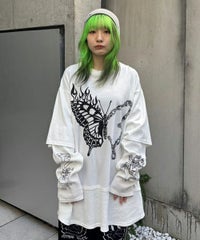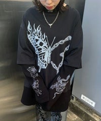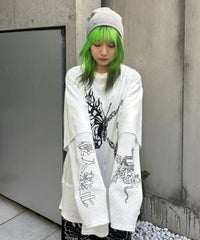 タトゥータッチのバタフライモチーフのグラフィックが インパクト大のレイヤード風デザインのトップス。 左袖にはパイソンモチーフ、右袖には「侵入禁止」のロゴ入り。 程よい肉感と軽やかさのある20/-天竺とワッフル素材を使用し さりげなく異素材を組み合わせているところがポイント。 オーバーシルエットに仕上げておりユニセックスでお楽しみいただけます。 同じグラフィックを使用したニットベストとビーニーを組み合わせた着こなしもオススメ◎ 1枚ではもちろん、レイヤードスタイルにも活躍間違いなしのアイテムです。